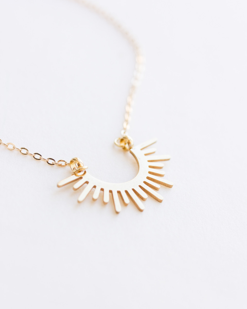 Capture the warmth and energy of a new day with this stunning Rising Sun Necklace. The geometric semi-circle pendant features radiating sunbeams, symbolizing new beginnings and positivity. Its minimalist design makes it a versatile piece that adds a touch of celestial charm to your everyday look, whether worn solo or layered with other gold favorites.